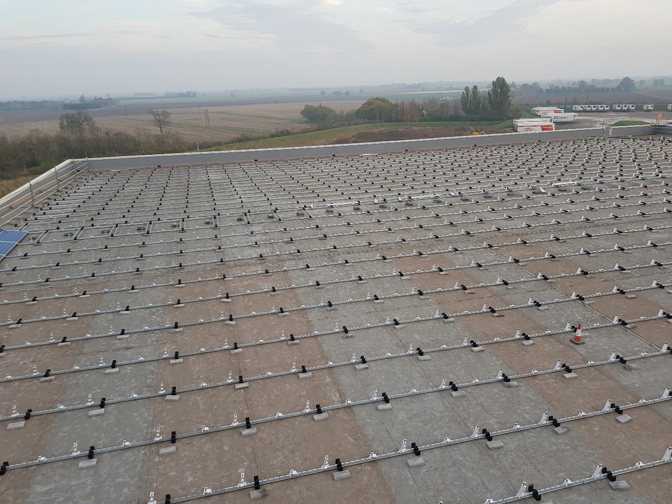 The base frame for the panels is laid out and secured to the roof with ballast.