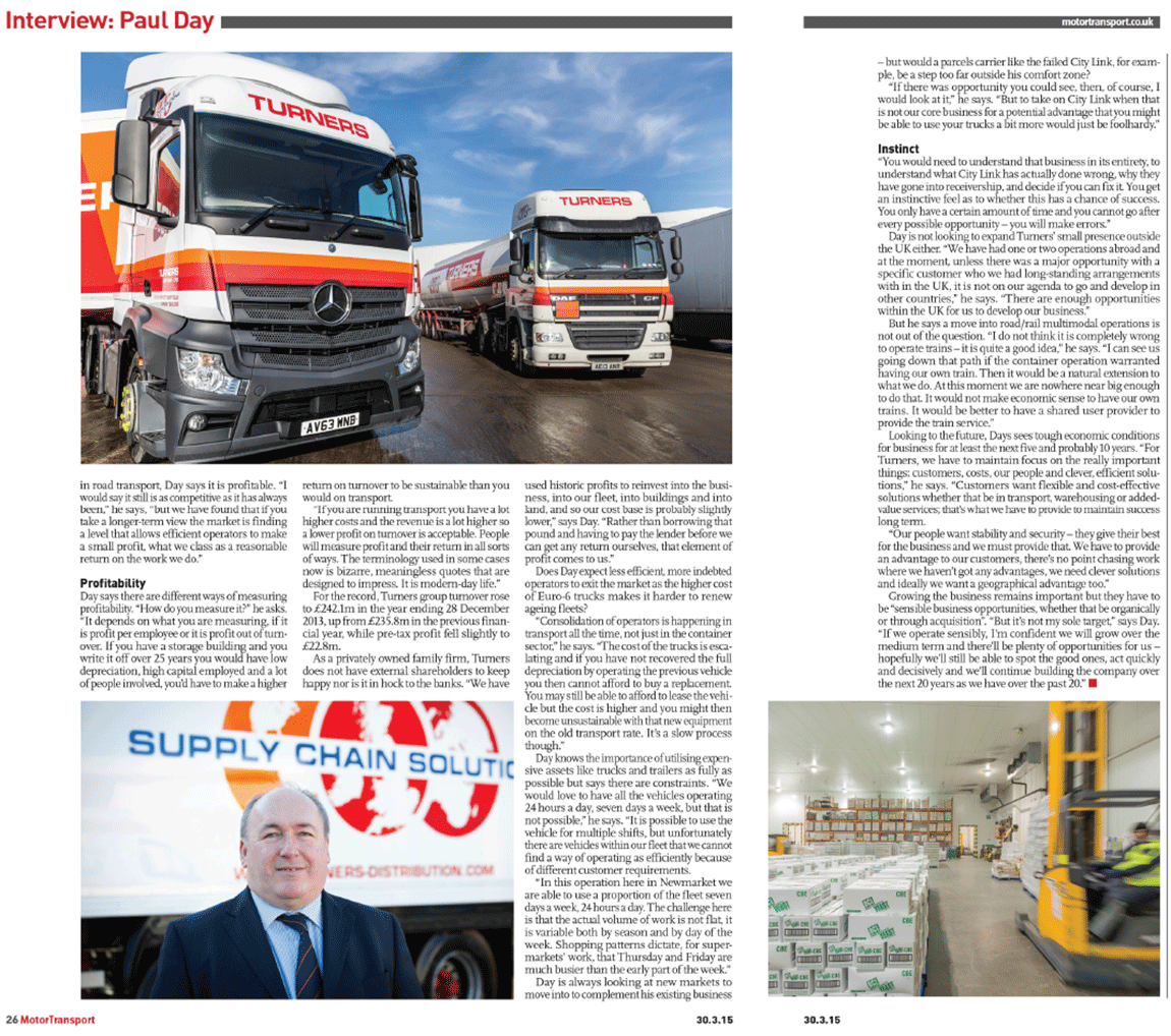 Motor Transport recently published (March 30th) a comprehensive and in-depth interview with our Managing Director Paul day. It gives a rare insight into Pauls business logic and how Turners have maintained its dominant position within key Transport Industry segments.